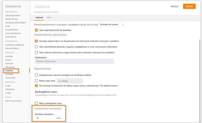 W ustawieniach konta, w sekcji Aktywności, można ustawić minimalny czas wymagany do rozpoczęcia pomiaru czasu przez stoper. Pozwala to kontrolować moment rozpoczęcia pomiaru, zapewniając rejestrowanie minimalnych czasów aktywności.